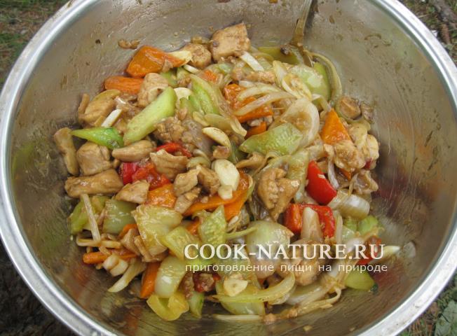 Я готовил на газовой горелке, но это блюдо также можно приготовить и на костре. В сковороду наливаем растительное масло, хорошенько его накаливаем и быстро обжариваем болгарские перцы в течение 40-50 секунд, затем перекладываем овощи в отдельную миску,