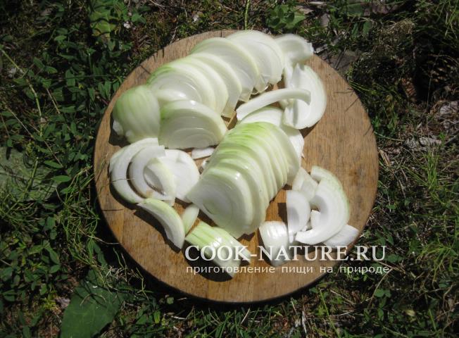 Крупной соломкой - очищенный репчатый лук,