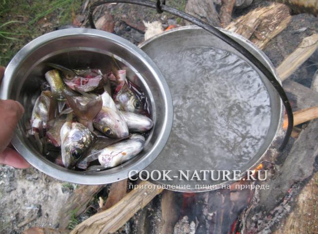 Если ваша вода в казане закипела, смело добавляйте в воду хвосты и головы рыбы.