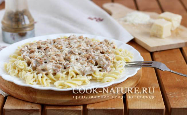 Это блюдо подается только горячим. Быстро раскладываем пасту по тарелкам, сверху кладем соус из лисичек и посыпаем оставшимся тертым сыром. Это очень вкусно и очень по-итальянски!