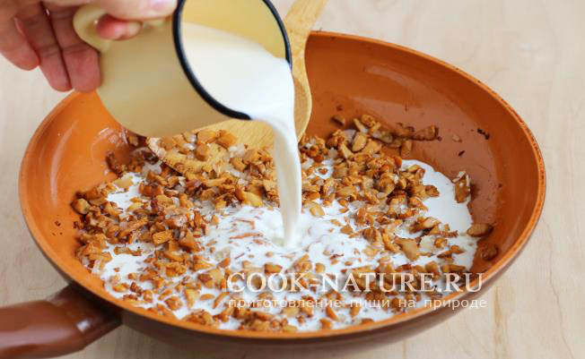 Как только грибы со сливками закипят, всыпаем большую часть тертого сыра в сковороду и размешиваем, чтобы расплавился сыр. Сыр позволит соусу загустеть и добавит своего вкуса. Добавляем мускатный орех и молотый перец.