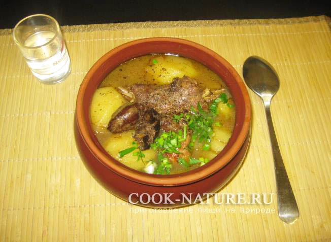 Рецепт тушеного с картошкой тетерева, приготовленного по типу шурпы. Дичь нарезается на небольшие куски, потом обжаривается до золотистого состояния, далее, к обжаренному тетереву добавляется лук и морковь, потом все заливается водой. В завершении готовки, к дичи добавляются целые картофелины, которые тушатся с дичью до полной готовности на умеренном огне. Если вы желаете приготовить простое, вкусное и сытное блюдо из дичи с картошкой, обязательно попробуйте этот рецепт.