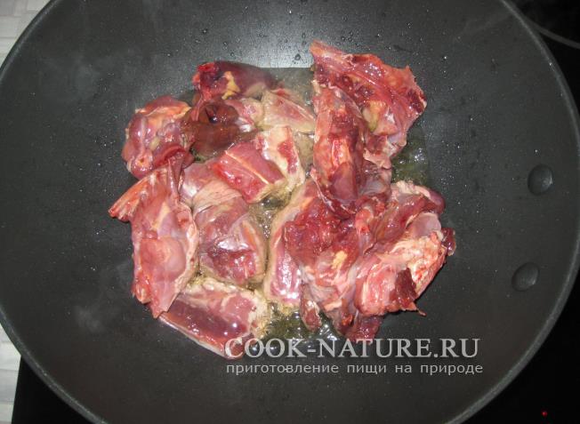 После обжаривания птицы добавьте к нему репчатый лук,