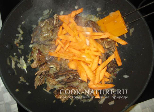 После пяти минут обжаривания птицы с луком закиньте в сковородку морковку,
