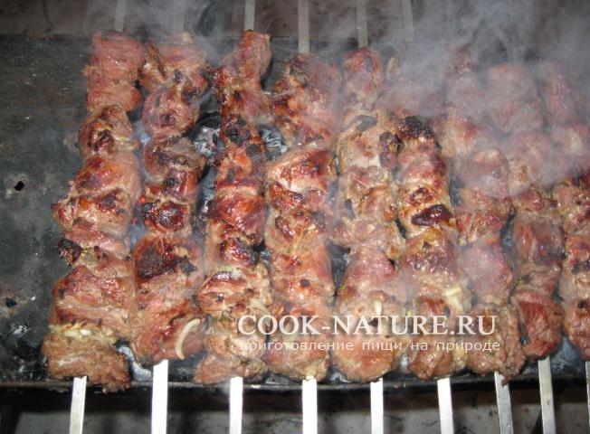 Далее, пышеший жаром и ароматами шашлык из говядины снимается с шампуров и подается к столу с нарубленным мелкими кольцами репчатым луком и измельченной зеленью петрушки, укропа и кинзы. Приятного аппетита, и конечно удачи в приготовлении описанного выше рецепта шашлыка из мраморной говядины.