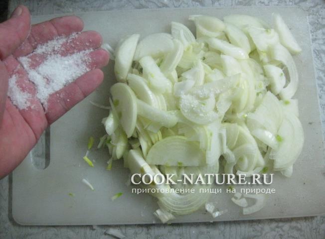 Посыпаем лук щепоткой соли крупного помола (нужно учесть, общее количество соли! Соль потом еще будет досыпаться вместе со специями, поэтому сыпем без фанатизма!), это нужно чтоб спровоцировать лук на выделение сока